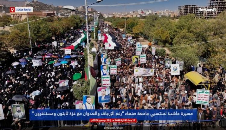 مسيرة حاشدة في جامعة صنعاء بعنوان “رغم الإرجاف والعدوان.. مع غزة ثابتون ومستنفرون”