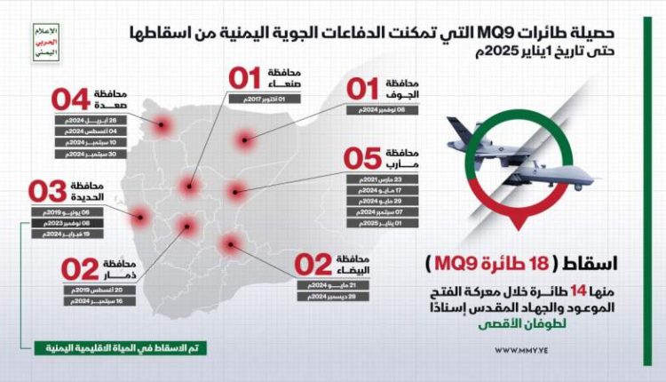 يضاف هذا العدد إلى أربع طائرات (إم كيو9) أخرى اسقطتها الدفاعات الجوية في أجواء العاصمة صنعاء، ومحافظات الحديدة وذمار ومأرب.