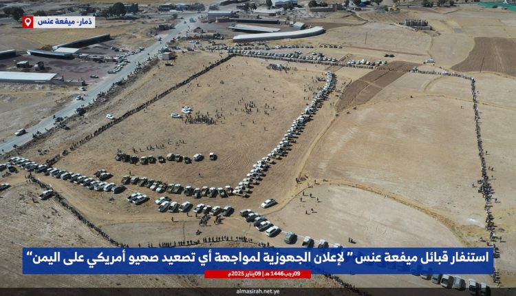 نظم أبناء مديرية ميفعة عنس بمحافظة ذمار، اليوم، لقاء قبلي مسلح ، إسناداً للشعب الفلسطيني ، وإعلاناً للنفير العام ، والجمهورية التامة لمواجهة التصعيد الصهيو أمريكي بريطاني على بلادنا.
