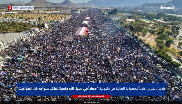خرجت بالعاصمة صنعاء مسيرة مليونية كبرى، في طوفان بشري متجدد نصرة وإسنادا للشعب الفلسطيني تحت شعار ” جهادا في سبيل الله ونصرةً لغزة سنواجه كل الطواغيت “.