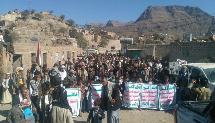 مسيرات ووقفات شعبية بمديرية عنس اساندآ لغزة واستعداد لمواجهة اي تصعيد صهيوني أمريكي.