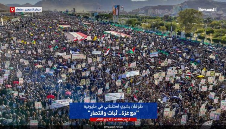 في مسيرة “مع غزة.. ثبات وانتصار”، شهدت ساحاتُ التظاهر زخمًا جماهيريًّا كَبيرًا وواسعًا وغير مسبوق؛ تتويجًا للمسيرات الشعبيّة السابقة المُستمرّة منذ عام كامل وبضعة أشهر، وتأكيدًا على ثبات الموقف اليمني المساند لغزة، ومباركة لانتصار غزة على العدوان الصهيوني الغاشم، فضلًا عن التأكيد على مواصلة كُـلّ الأنشطة اليمنية المساندة لفلسطين.