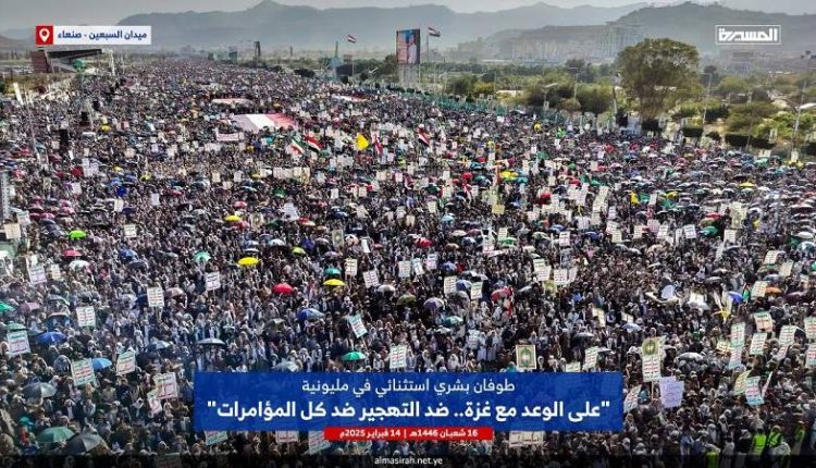 ومع دعوة السيد القائد العلم عبد الملك بدر الدين الحوثي -يحفظه الله- الشعب اليمني الخروج المشرف لساحات التظاهر رفضاً لمخطّط التهجير الأمريكي لسكان غزة، تقاطر ملايين اليمنيين إلى مئات الساحات بكل حماس وتلهف وشوق، ما يوحي بتجذر القضية الفلسطينية في وجدان ومشاعر كافة الشعب اليمني العظيم.