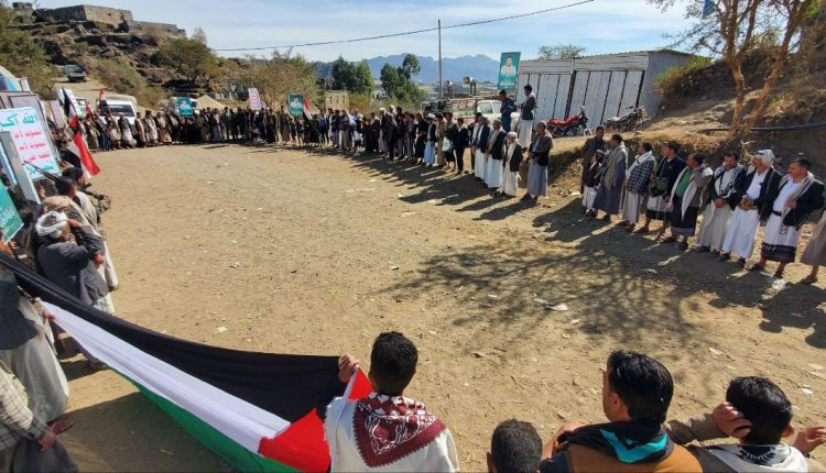 وقفة لأبناء مربع ربيعة بني بحر بمديرية عتمة تنديدا بالمخطط الأمريكي لتهجير أبناء غزة