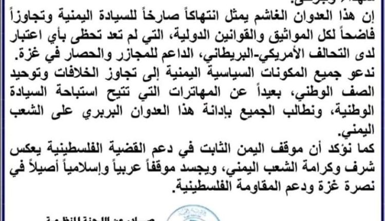 وأوضح البيان، أن هذا العدوان الإجرامي يعكس تجاهل التحالف الأمريكي البريطاني للقوانين الدولية، خاصة في ظل دعمه المستمر للمجازر والحصار في غزة، داعية جميع المكونات السياسية اليمنية إلى تجاوز الخلافات وتوحيد الصف الوطني، بعيداً عن المهاترات التي تتيح استباحة السيادة الوطنية.