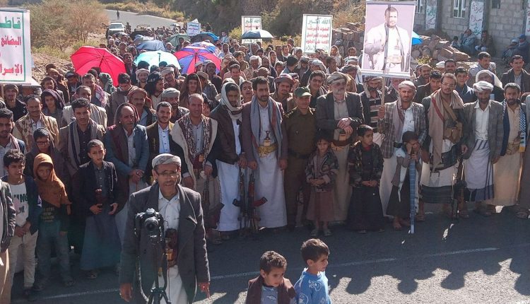 مسيرة جماهيرية بمديرية مغرب عنس بعنوان “ثابتون مع غزة ونواجه التصعيد الأمريكي بالتصعيد”