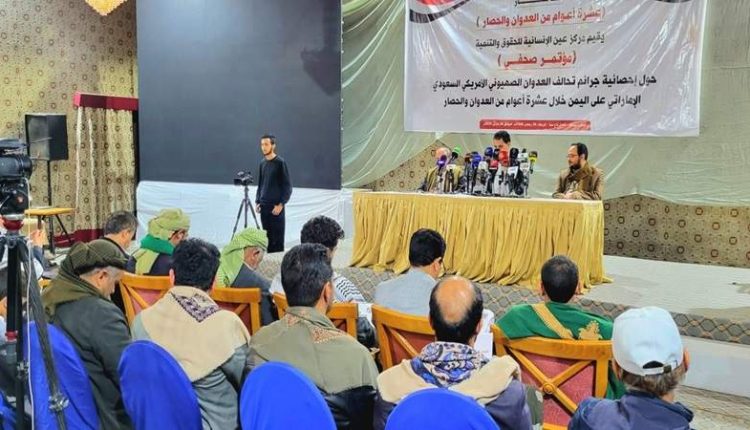 عقد مركز عين الإنسانية للحقوق والتنمية اليوم الأربعاء، مؤتمرا صحفيا لعرض إحصائية حول جرائم تحالف العدوان الأمريكي، السعودي والإماراتي على اليمن تحت شعار “عشرة أعوام من العدوان والحصار”.