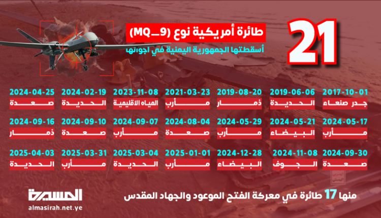 انفو جرافيك.. حصيلة الطائرات الأمريكية إم كيو ٩ التي تم إسقاطها في اليمن في 3 أبريل, 2025 60 شارك ذمــار نـيـوز || مـتـابعات || 3 أبريل 2025مـ – 5 شوال 1446هـ انفو جرافيك.. حصيلة الطائرات الأمريكية إم كيو ٩ التي تم إسقاطها في اليمن 60 شارك FacebookTwitterGoogle+ReddItWhatsAppPinterestالبريد الإلكتروني