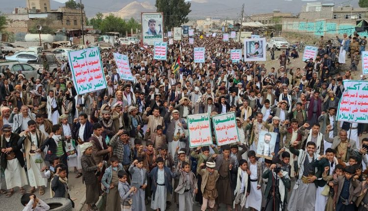 أربع مسيرات جماهيرية حاشدة بمديرية ضوران آنس تحت شعار “جهاد وثبات واستبسال.. لن نترك غزة”.