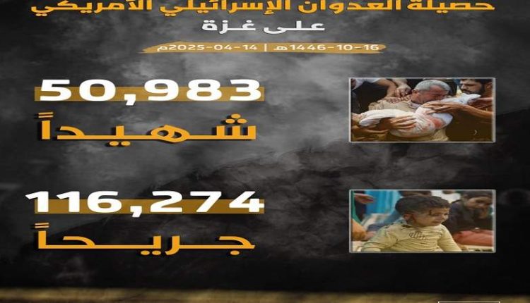 في حين، ارتفعت حصيلة العدوان الإسرائيلي إلى 50 ألفًا و983 شهيدًا، و116 ألفًا و274 مصابًا منذ السابع من أكتوبر للعام 2023م.