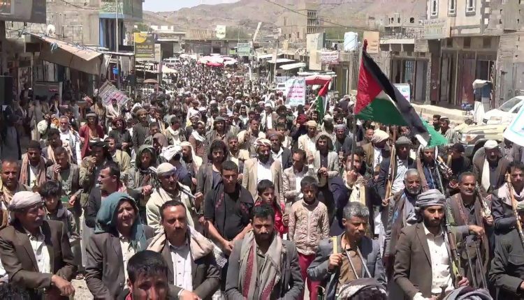 مسيرتان حاشدتان بمديرية الحداء تحت شعار ” ثابتون مع غزة على رغم انف العدو الامريكي وجرائمه”