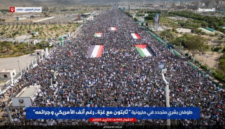 تحت شعار “ثابتون مع غزة.. رغم أنف الأمريكي وجرائمه”.. طوفان مليوني بصنعاء نصرة لفلسطين