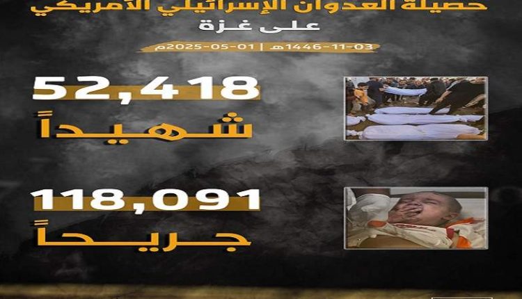 وأشارت إلى ارتفاع حصيلة العدوان الاسرائيلي الى 52,418 شهيداً و 118,091 إصابة منذ السابع من أكتوبر للعام 2023م.