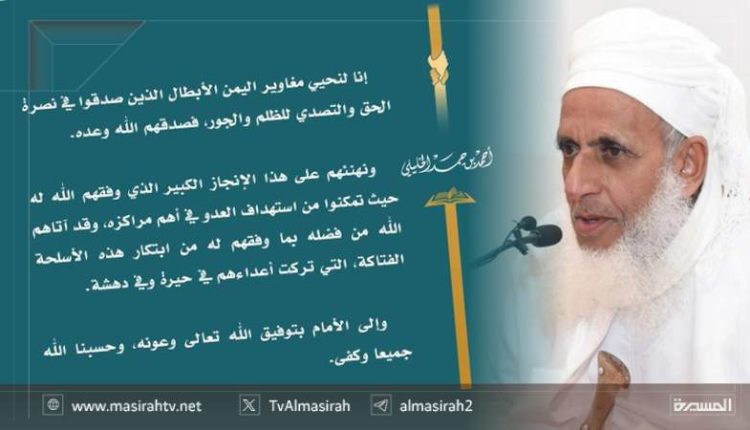 وأضاف: “أبطالُ اليمن حقّقوا إنجازًا كَبيرًا واستهدفوا العدوَّ في أهم نقاطه، ووفَّقهم الله لابتكار أسلحةٍ فَتَّاكَةٍ تركت العدوِّ في حَيرة ودهشة”.