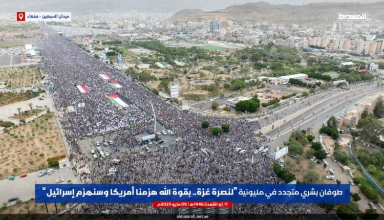 احتفالًا بالفشل الأمريكي.. مسيراتٌ مليونية في صنعاء تحت شعار “لنصرة غزة .. بقوة الله هزمنا أمريكا وسنهزم (إسرائيل)”