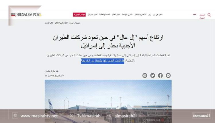 وقالت: “بينما استأنفت بعضُ شركات الطيران الأجنبية رحلاتِها إلى يافا، قرّرت أُخرى شطبَ (إسرائيل) من خارطتها تمامًا؛ مما يزيد من تعقيد المشهد الاقتصادي”.