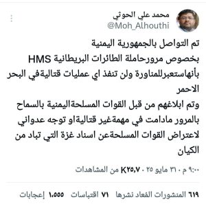 أوضح عضو المجلس السياسي الأعلى محمد علي الحوثي، أنه تم التواصل بالجمهورية اليمنية بخصوص مرور حاملة الطائرات البريطانية “HMS” في البحر الأحمر دون تنفيذ أي عمليات قتالية.