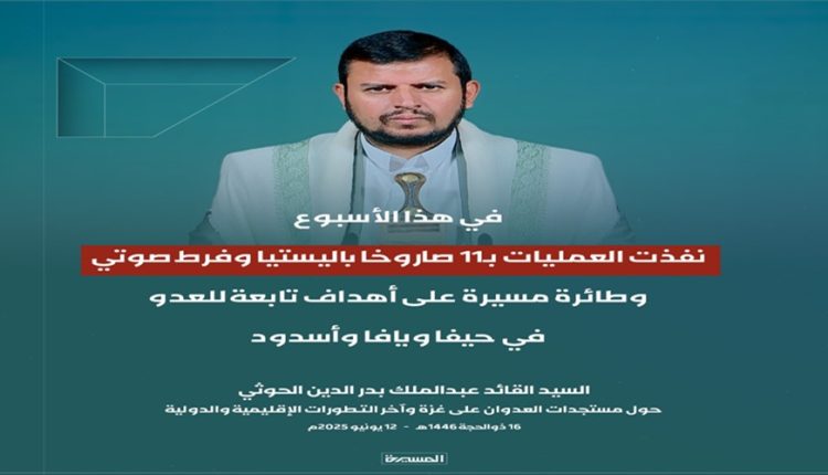 ولفت السيد القائد إلى أن “عملياتنا لهذا الأسبوع تأتي في إطار العمل المُستمرّ الهادف لفرض حصار جوي على العدوّ الإسرائيلي”، مبينًا أن “قواتنا تسعى لتحقيق الحصار الجوي ردًّا على تصعيد العدوّ الإسرائيلي وارتكابه جرائم الإبادة”.