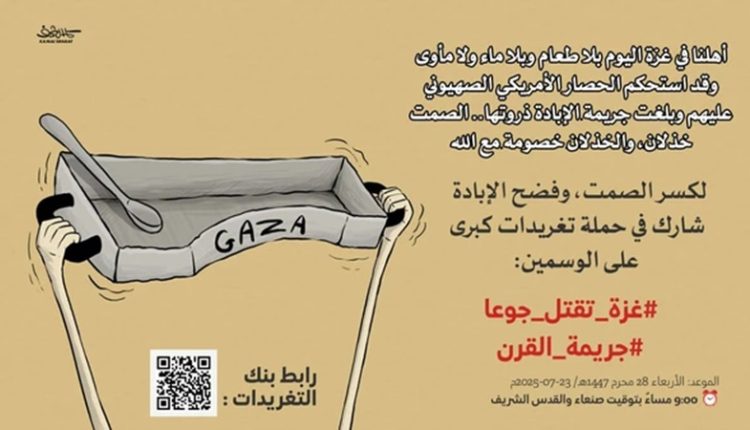 تنطلق في الساعة التاسعة من مساء اليوم، الأربعاء، بتوقيت صنعاء والقدس الشريف، حملة تغريدات واسعة على موقع التواصل الاجتماعي “إكس ” لكشف جريمة الحصار والتجويع في غزة.