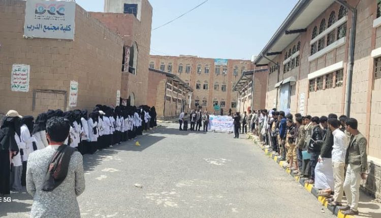 وقفة طلابية في كلية مجتمع الدرب بذمار، تحت شعار”ثابتون مع غزة، صامدون في وجه العدوان الصهيوني”