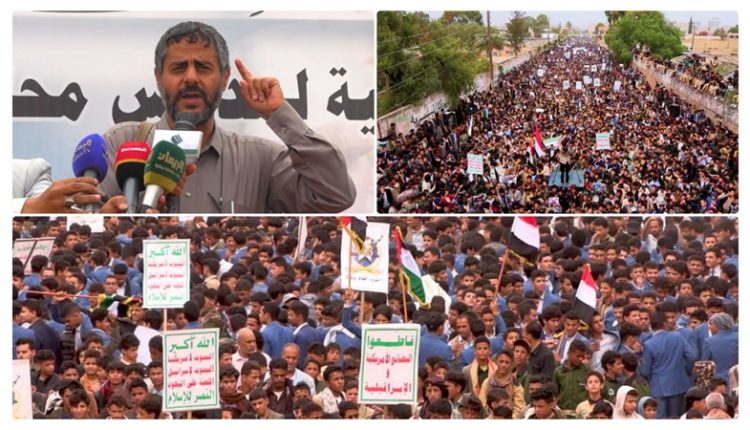 وخلال المسيرة، أكّـد المحافظ محمد البخيتي، أن اليمنَ يقوم بواجبه الجهادي في نصرة الأشقاء في غزة، وأن الهدف من عملياته هو وقف العدوان الصهيوني عليها ورفع الحصار عن سكانها، لافتًا إلى الهدفَ الأهم هو “تحرير فلسطين”، والمسؤولية التي تقع على الأجيال الصاعدة في تحقيق هذا الهدف.