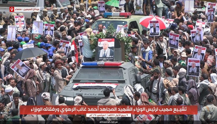 وُورِيَ جُثمانُ رئيس حكومة التغيير والبناء الشهيد أحمد غالب الرهوي ورفاقه الوزراء الشهداء الثرى في العاصمة صنعاء إلى جوار شهيد اليمن الكبير الرئيس صالح بن علي الصمَّاد، في تشييعٍ مهيبٍ لم يغِظْ سوى الأعداء والخونة والعملاء.
