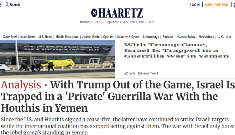 أكّـدت صحيفة “هآرتس” الصهيونية، أنهُ وفي ظل “غياب الدعم الأمريكي”، يبدو أن “(إسرائيل) تُركت وحدَها في الساحة لتدير حربها ضد المسيّرات والصواريخ اليمنية”، وباتت تبحث عن “طرق إبداعية لمواجهة الخطر اليمني” دون خسائر، ضمن استراتيجية “تعكير مزاج اليمنيين؛ وبالنتيجة انتفاضة ضد الحوثيين”، ودعم الأطراف الموالية للتحالف لقتالهم.