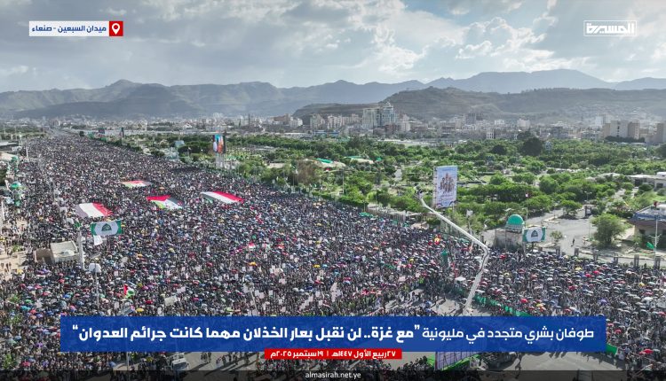 وحيَّا الشعبُ اليمني في بيان المسيرة “صمودَ الشعب الفلسطيني، ونباركُ العملياتِ العسكريةَ الأخيرةَ للمقاومة الفلسطينية المسدَّدةَ بتوفيقِ اللهِ والمنكِّلةَ بالعدوّ الصهيوني التي أثبتت فَشَلَه في تحقيق أي انتصار يُذكَرُ رَغْمَ ما ارتكبه من إجرام وإبادة”.