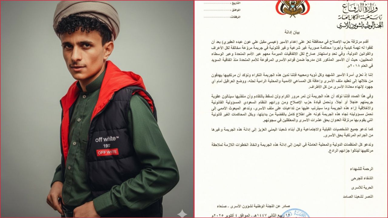 وقالت اللجنة في بيان لها: “إن مرتزقة حزب الإصلاح أقدموا على إعدام الأسير عيسى مقبل العفيري بصورة وحشية، بعد أن لفقوا له تهمة كيدية وأجروا له محاكمة غير قانونية”، مؤكدة أن هذه الممارسات الإجرامية تكشف مجددًا طبيعة تلك المليشيات وارتباطها بأجندات تخدم قوى العدوان.