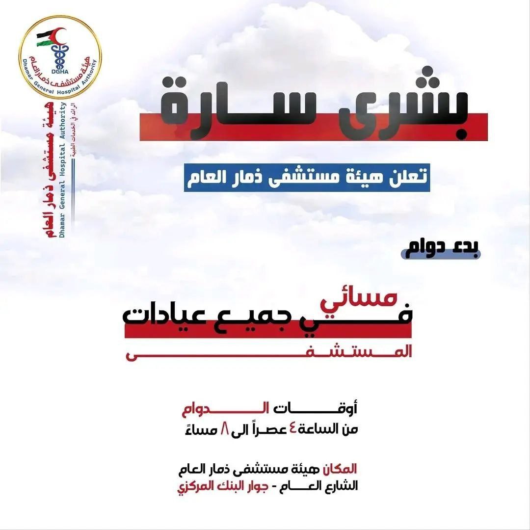 أعلنت هيئة مستشفى ذمار العام عن بدء العمل في الفترة المسائية لأول مره إلى جانب الفترة الصباحية في جميع مراكز وأقسام وعيادات الهيئة.