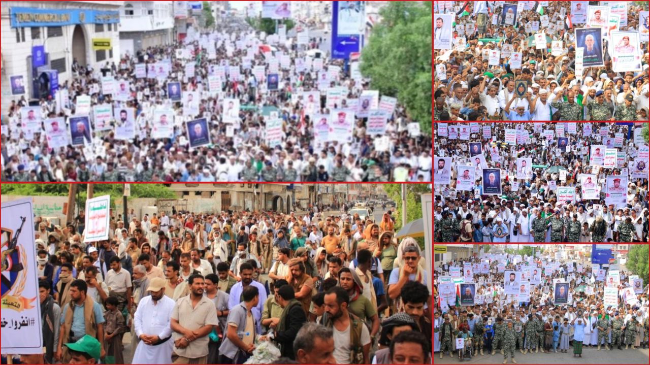 في مدن المحافظة ومديرياتها وقراها حمل المتظاهرون شعارات التجنيد الوطني والإسناد، وكانت خطابية الحضور واضحة: هذا خرج ضخم لا ينطفئ ولا يزول مع صيحات اللحظة، بل هو عبارة عن تكريس لوتيرة عاليةٍ من الدعم والمواجهة لكل محاولات الاستهداف أو النكث.