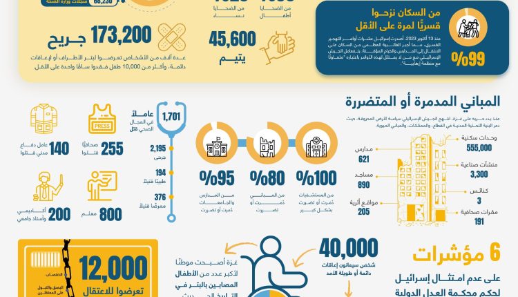 وأكد المرصد الأورومتوسطي أن هذه الإحصاءات تمثل مؤشرًا خطيرًا على حجم الانتهاكات الإسرائيلية الجسيمة لحقوق الإنسان والقوانين الدولية، داعيًا إلى تحرك دولي عاجل لتقديم الجناة للمحاسبة ومنع تكرار هذه الجرائم.