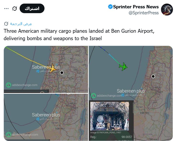 وأظهرت مواقع التتبّع الجوي وصول عدة طائرات شحن عسكرية أمريكية إلى مطار “بن غوريون” في الأراضي المحتلة، تحمل على متنها قنابل ثقيلة ومعدات عسكرية. وأشارت البيانات إلى أن ما لا يقل عن ثلاث طائرات شحن أمريكية هبطت خلال الساعات الماضية، تزامنًا مع وصول طائرات للتزود بالوقود جوًا، في إطار تعزيز الإمدادات العسكرية الصهيونية.