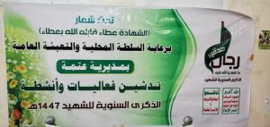 دشنت السلطة المحلية والتعبئة العامة في مديرية عتمة محافظة ذمار اليوم فعاليات وأنشطة الذكرى السنوية للشهيد للعام 1447ه‍ تحت شعار”الشهداء عطاء قابله الله بعطاء”