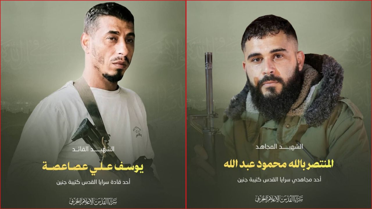 وقالت السرايا في بيان النعي إن الشهيد القائد يوسف علي عصاعصة (37 عامًا)، أحد قادة كتيبة جنين – سرية قباطية، والشهيد المجاهد المنتصر بالله محمود عبد الله (26 عامًا) من مجاهدي السرية نفسها، “ارتقيا إلى العلا بعد مسيرة حافلة بالجهاد والمقاومة”، وذلك عقب عملية إعدام ميداني نفذتها قوات الاحتلال النازي بحقهما بعد نفاد ذخيرتهما أثناء الاشتباك.