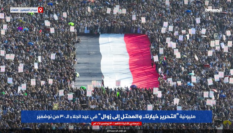 صنعاء تشهد حشداً مليونياً تاريخياً في عيد الجلاء والشعب يؤكد: سندحر المحتل الجديد ولن نترك فلسطين
