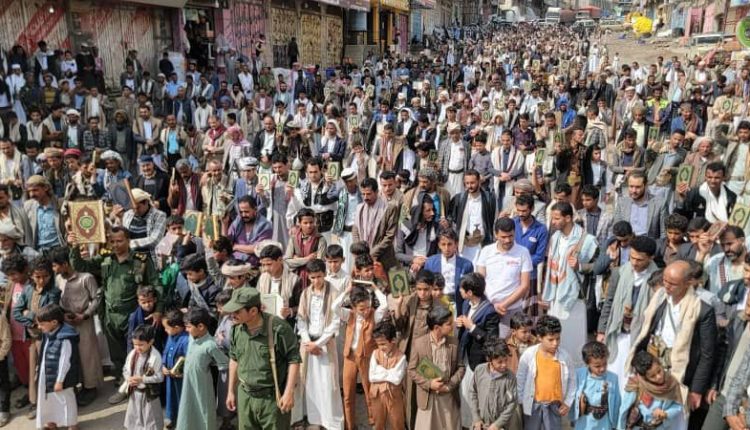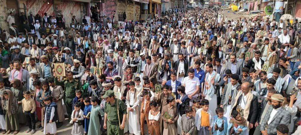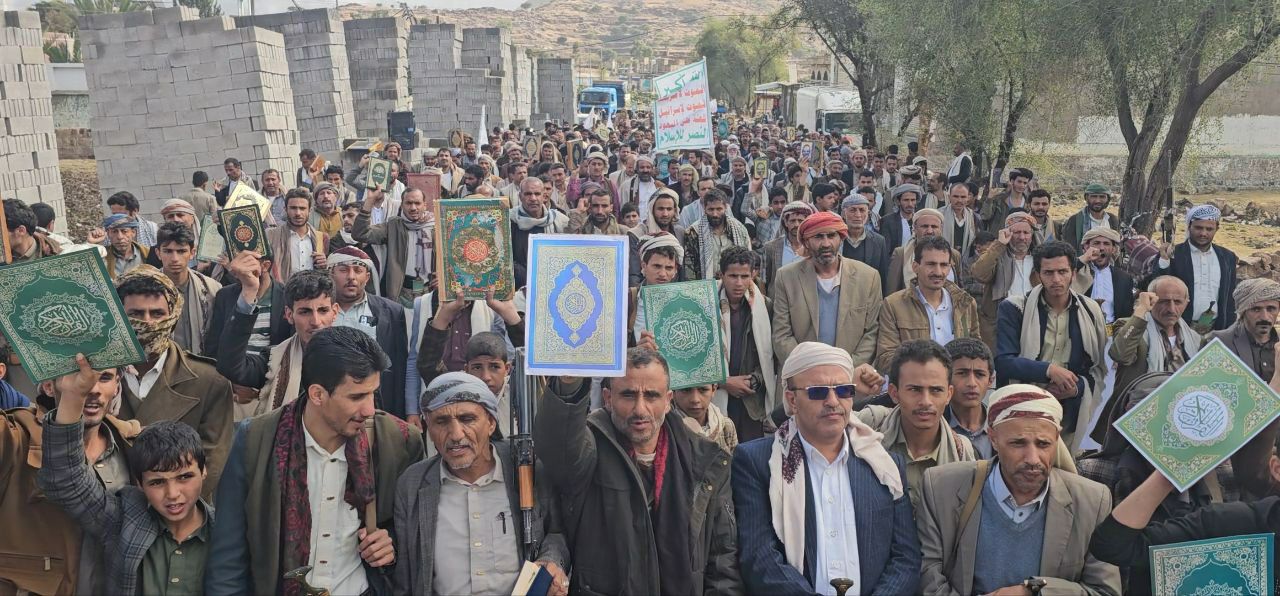 فيما أكد بيان مُشترك صادر عن المسيرات، اعتصامنا بحبل الله المتين، وتمسكنا بكتابه العظيم مصدر عزتنا وكرامتنا وسبيل نجاتنا في الدنيا والآخرة، مُعلناً رفضنا القاطع والواضح لأي إساءة أو استهداف له، مُحملاً الولايات المُتحدة الأمريكية ومعها بريطانيا والعدو الصهيوني المسؤولية الكاملة عن هذه الإساءات المُتكررة التي تعكس حقدهم الشديد وعداوتهم الصريحة للإسلام والمسلمين