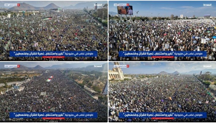 صنعاء.. خروج مليوني حاشد بميدان السبعين في مسيرة “نفير واستنفار.. نصرة للقرآن وفلسطين”