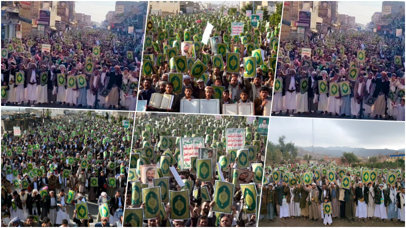 وأكد بيان صادر عن المسيرات، أن ما يتعرض له القرآن الكريم أقدس مقدسات الإسلام من حملات إساءة متكررة وممنهجة جزء من الحرب اليهودية الصهيونية الشاملة التي تستهدف الإسلام والمسلمين ومقدساتهم وتتزعمها أمريكا وإسرائيل وبريطانيا ويتبعهم في ذلك أولياء الشيطان الرجيم.