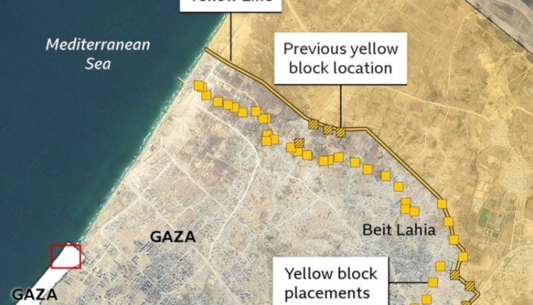 وأظهرت الصوراستناداً إلى تحليل صور الأقمار الصناعية التي أجرتها وحدةBBC Verify،أن العدو الصهيوني وضع في البداية كتلاً خرسانية صفراء في ثلاثة مواقع على الأقل، ثم أعاد لاحقاً نقل هذه العلامات إلى داخل الأراضي الفلسطينية، ما أدى وفق التحليل إلى دفع الخط الأصفر إلى داخل القطاع.