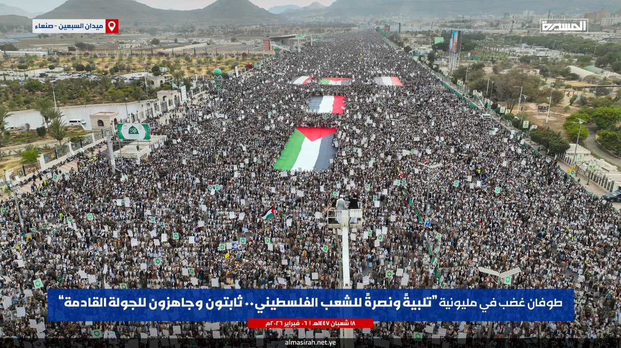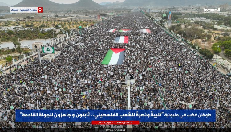 حشد مليوني في صنعاء بعنوان “تلبية ونصرة للشعب الفلسطيني.. ثابتون وجاهزون للجولة القادمة”