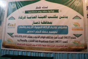 دشن مكتب الهيئة العامة للزكاة بمحافظة ذمار، اليوم، مشروع توزيع الزكاة العينية من محاصيل الحبوب للفقراء والمساكين لموسم حصاد 1447هـ – تحت شعار “وآتوا حقه يوم حصاده”.