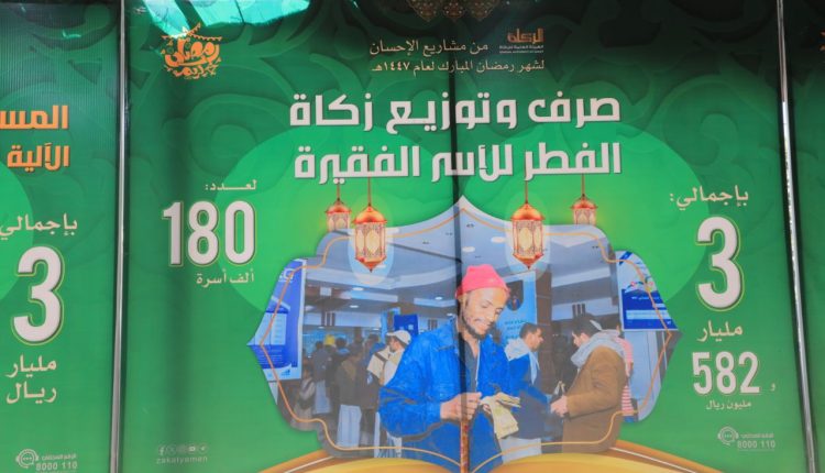 وفي التدشين الذي حضره أمين العاصمة الدكتور حمود عُباد، أكد رئيس الهيئة العامة للزكاة الشيخ شمسان أبو نشطان، أن مشاريع الإحسان الرمضانية توزعت على ثلاثة مجالات، الأول شمل مشاريع الصرف اللامركزي عبر مكاتب الزكاة بالأمانة والمحافظات، يصل خيرها للأسر العاجزة عن العمل شهرياً لـ 43 ألف أسرة بإجمالي اثنين مليار و579 مليون ريال.