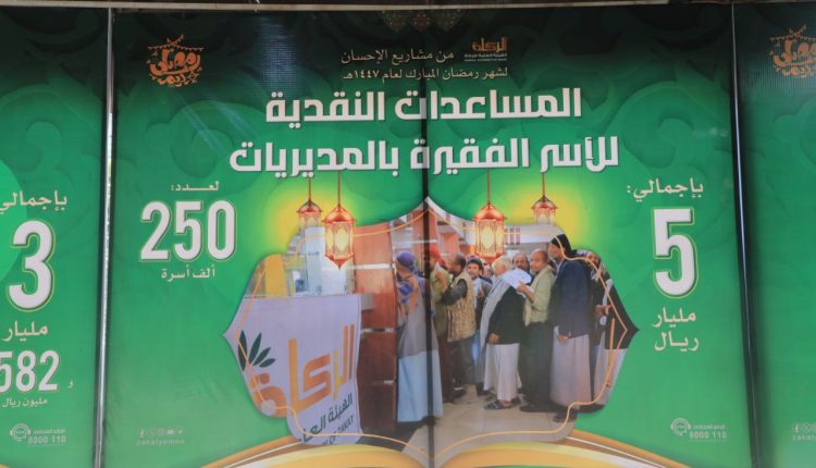 وقال “شمل المجال الثالث أيضاً، دعم مراكز رعاية وإيواء المتشردين “المرضى النفسيين غير المصحوبين” لـ 250 مستفيدًا بتكلفة 150 مليون ريال، ومساعدات النازحين من أبناء “حيس والخوخة وجبل رأس” بالحديدة لألفي مستفيد بتكلفة 50 مليون ريال، ودعم الأفران والمطابخ الخيرية لألفي أسرة بقيمة 100 مليون ريال، ومساعدات مالية فردية طارئة بإجمالي 493 مليون ريال، وصرف مساعدات نقدية للفقراء في كشوفات مستثمري الكسارات 10 آلاف مستفيد بتكلفة 200 مليون ريال، وتكريم ألفًا و300 من العلماء بتكلفة 200 مليون ريال”.