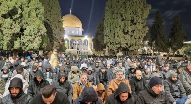 وأدى نحو 35 ألف مصلٍّ، مساء اليوم الخميس، صلاتي العشاء والتراويح في رحاب المسجد الأقصى المبارك. وبحسب دائرة الأوقاف الإسلامية، فقد امتلأت المصليات المسقوفة والساحات بالمصلين الذين وفدوا من مختلف أحياء مدينة القدس، ومن أراضي 48، رغم الانتشار المكثف لقوات الاحتلال عند مداخل البلدة القديمة وأبواب المسجد.