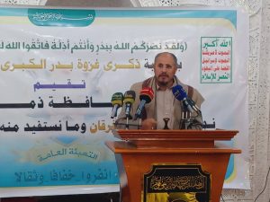 وخلال الفعالية، التي حضرها محافظ ذمار محمد البخيتي، ومسؤول التعبئة العامة أحمد الضوراني، أشار عضو المكتب السياسي لأنصار الله، ضيف الله الشامي، إلى دلالات ذكرى غزوة بدر الكبرى في استذكار مواقف النبي صلوات الله وسلامه عليه وعلى آله، وانطلاقته، والأهداف الأساسية والترتيبات التي هيأها الله لهذه المعركة.