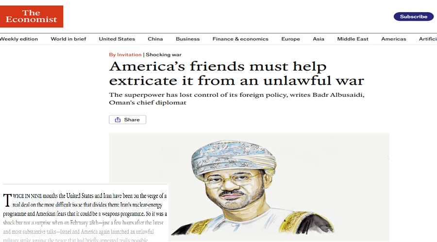 دعا وزير خارجية​سلطنة عُمان​ بدر البوسعيدى، في مقالٍ له بصحيفة “الإيكونوميست” الصادرة بالإنجليزية، الأربعاء، بأنّ “على أصدقاء أمريكا المساعدة في إخراجها من حربٍ غير مشروعة”، مشدّدًا على أنّ الدول العربية التي كانت تثق بالتعاون الأمني ​​الأمريكي “باتت تعاني من هذا التعاون”.