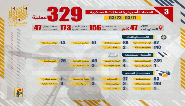 الإعلام الحربي التابع للمقاومة – حزب الله، نشر مساء الثلاثاء، حصاد العمليات العسكرية في أسبوعٍ فقط (329) عملية، ضد كيان العدوّ الإسرائيلي، واليوم نفذّت المقاومة وفقًا للبيانات العسكرية الصادرة عنها، (55) عملية، وذلك حتى لحظة كتابة هذا التقرير، كونها في تزايدٍ مستمر.