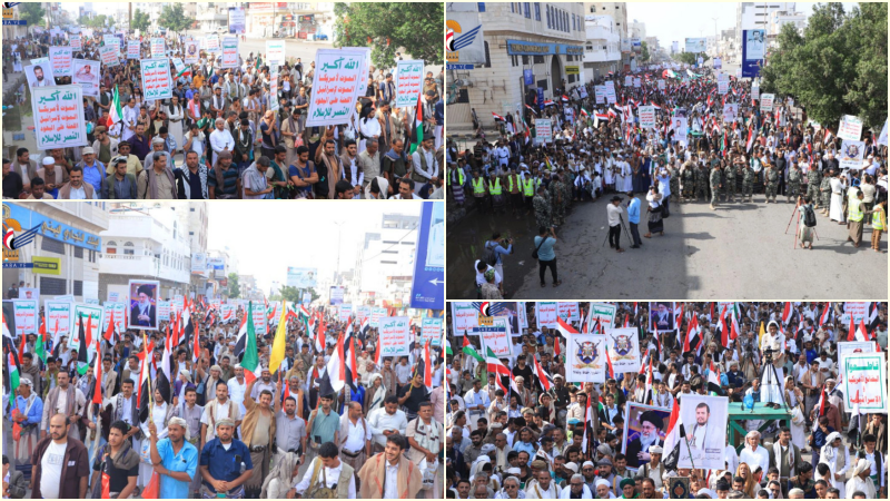 ورفع المشاركون في المسيرات، الأعلام اليمنية والفلسطينية واللبنانية والإيرانية، منددين بجرائم الإبادة الجماعية التي يرتكبها الكيان الغاصب في غزة والضاحية الجنوبية وإيران.