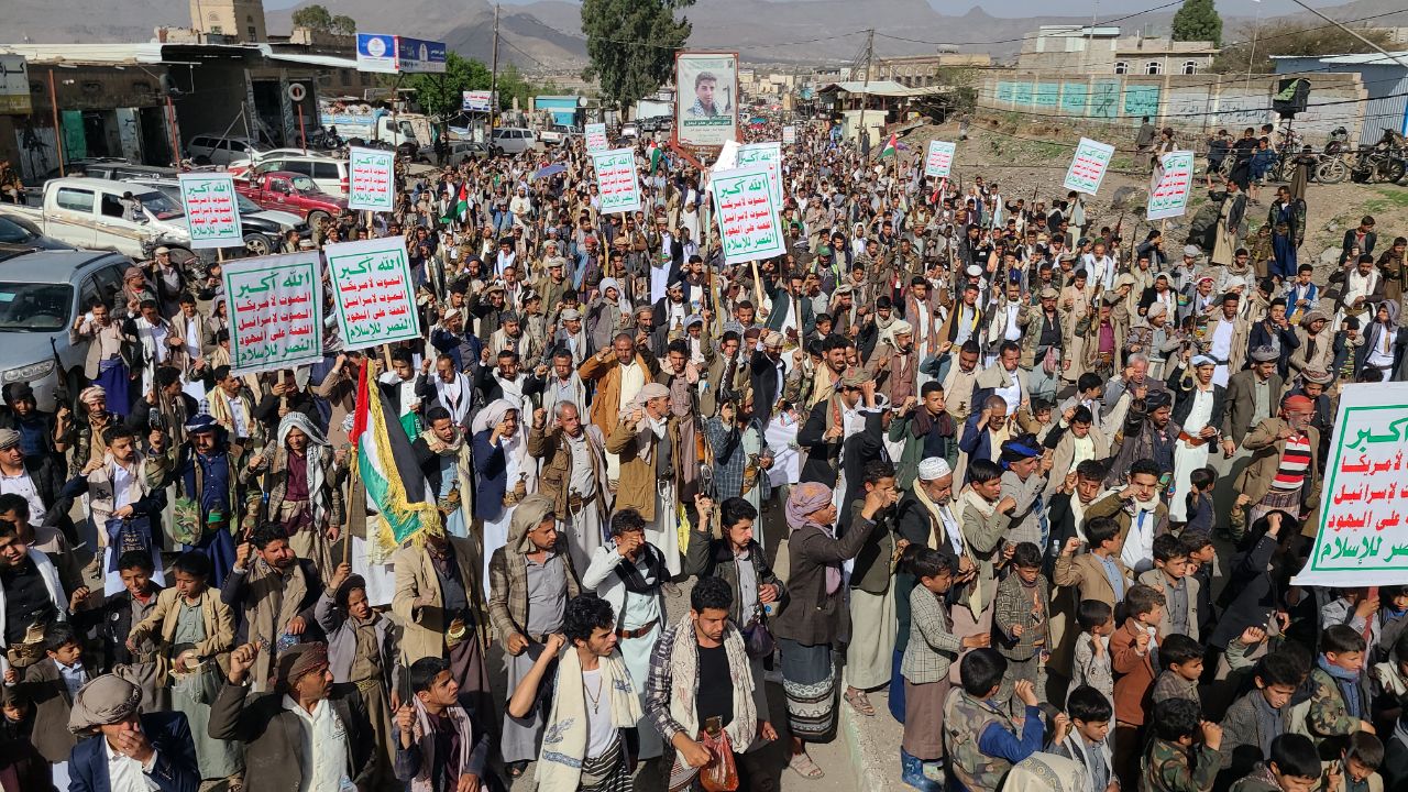 وأوضح بيان صادر عن المسيرات أن خروج الشعب اليمني يأتي جهاداً في سبيل الله وابتغاءً لمرضاته ووقوفاً في صف واحد كالبنيان المرصوص مع إخوانهم في محور الجهاد والمقاومة، محور الإسلام، في مواجهة محور الكفر والمخطط الصهيوني اليهودي المسمى بـ “إسرائيل الكبرى” الذي يستهدف كل الأمة بدون استثناء.